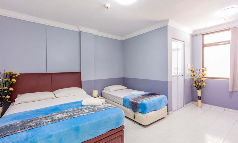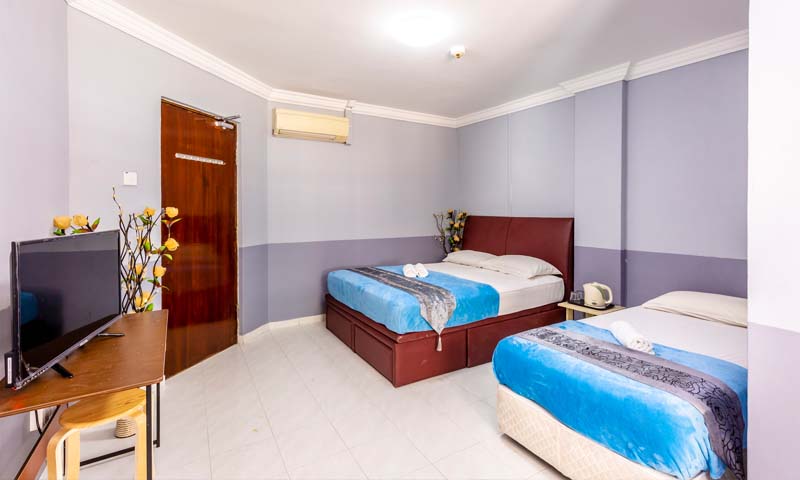 Our triple air-conditioned guestrooms come with 1 queen-size bed & 1 single bed, cozy décor and warm lighting. Each room has amenities that include TV, kettle, hair dryer and complimentary water, 24 hours hot shower facilities and toiletries are provided. Free WIFI available all day!